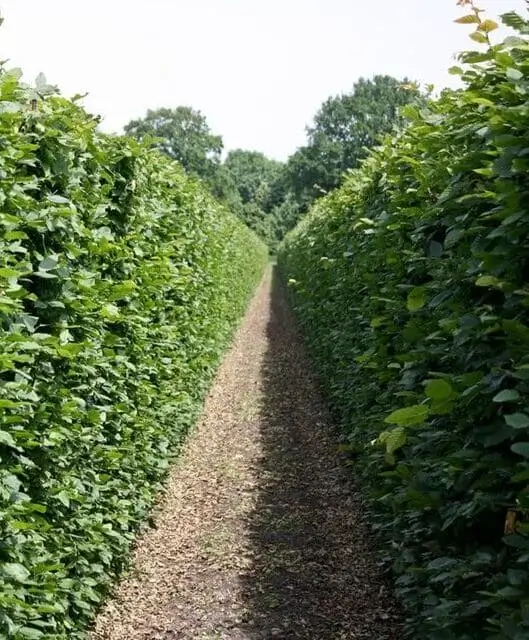 Граб — хороший вибір, якщо хочеться природного вигляду. Його особливість у тому, що сухе листя часто тримається на гілках навіть узимку, тому огорожа не виглядає “голою”.